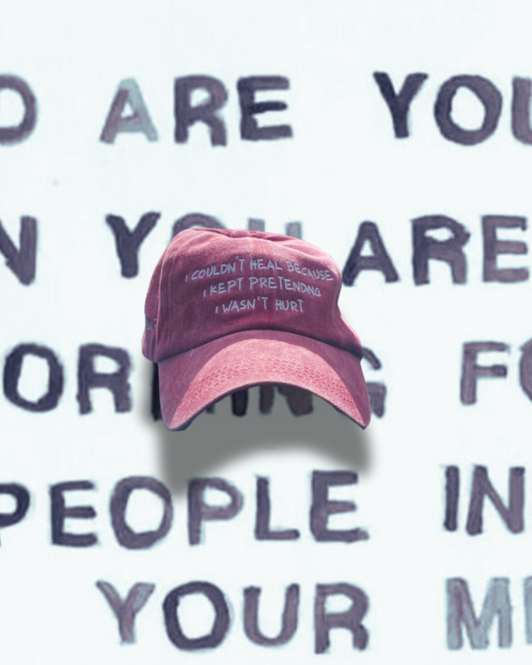 “A statement hat with a purpose. Soft, structured, and designed to speak what the heart often hides. Made for those on a healing journey, this hat features the bold message: ‘I couldn’t heal because I kept pretending I wasn’t hurt’ — a reminder to feel, to face, and to grow.”